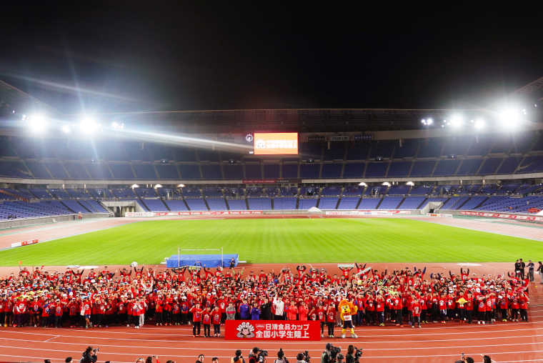 そんな思いで日清食品カップ全国小学生陸上競技交流大会が1985年に始まりました。この大会を通じて、小学生が陸上を楽しみながら、目標を持ったり、友だちを作ったり、仲間を応援するなど、さまざまな経験を積むことができるよう、全国各地で行われる「都道府県交流大会」と、都道府県の代表選手が参加する「全国交流大会」を開催しています。